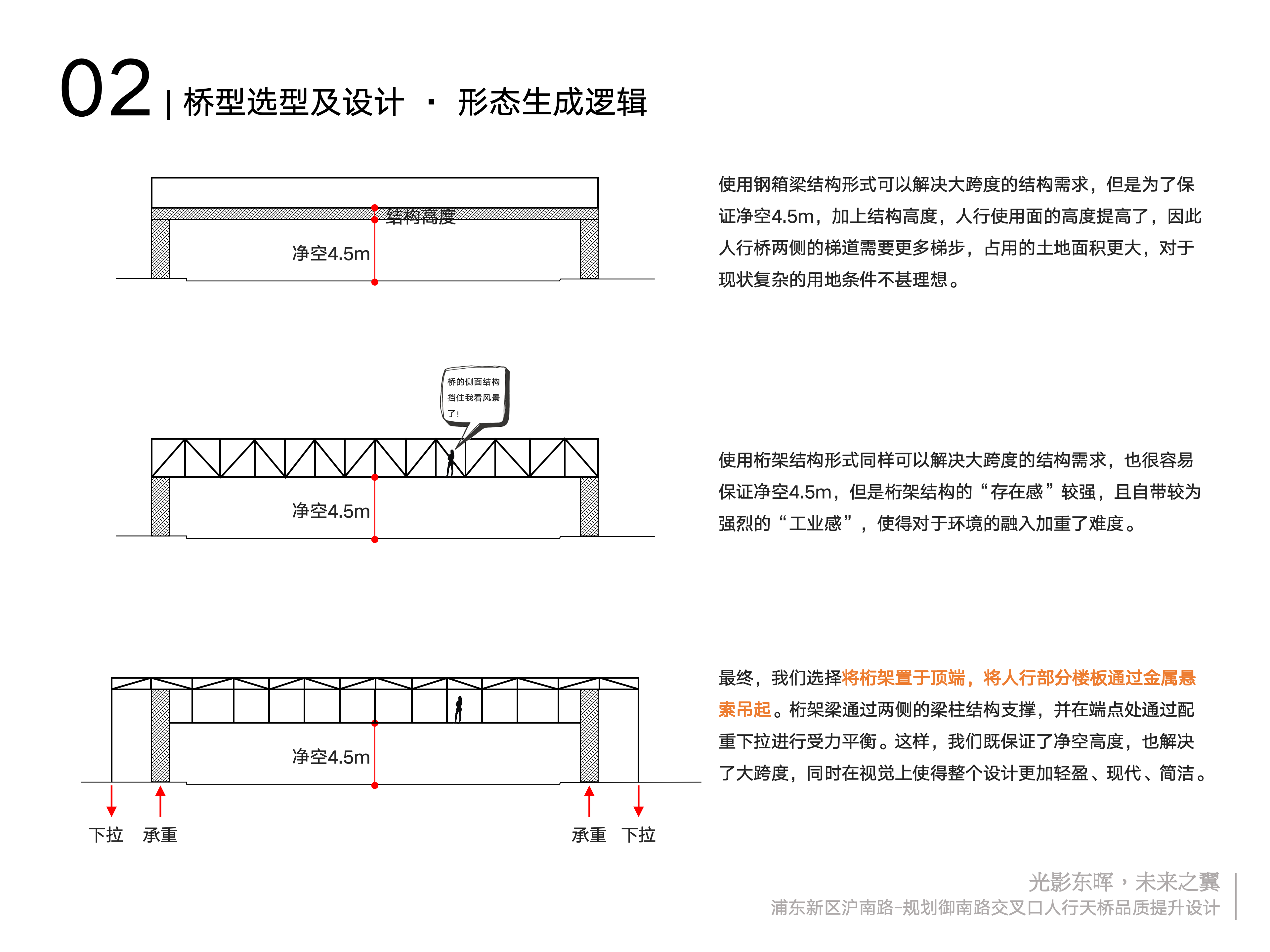- 对于人行桥的结构选型,我们考虑到为保证桥下净空4.5米,加上钢箱梁的结构高度,人行使用面高度提高了,人行桥两侧的梯道需要更多梯步,占用的土地面积更大,对于现状复杂的用地条件不甚理想。