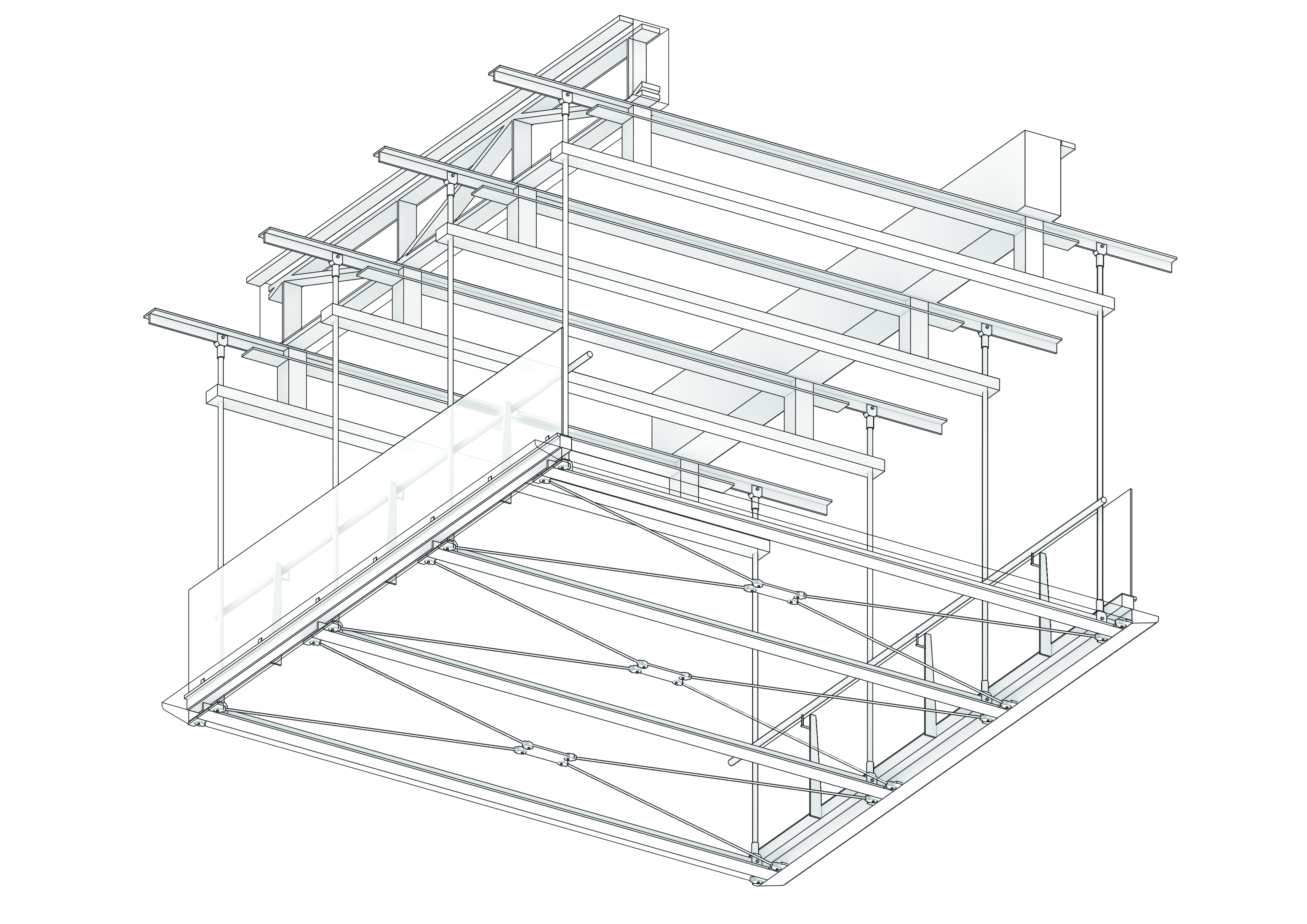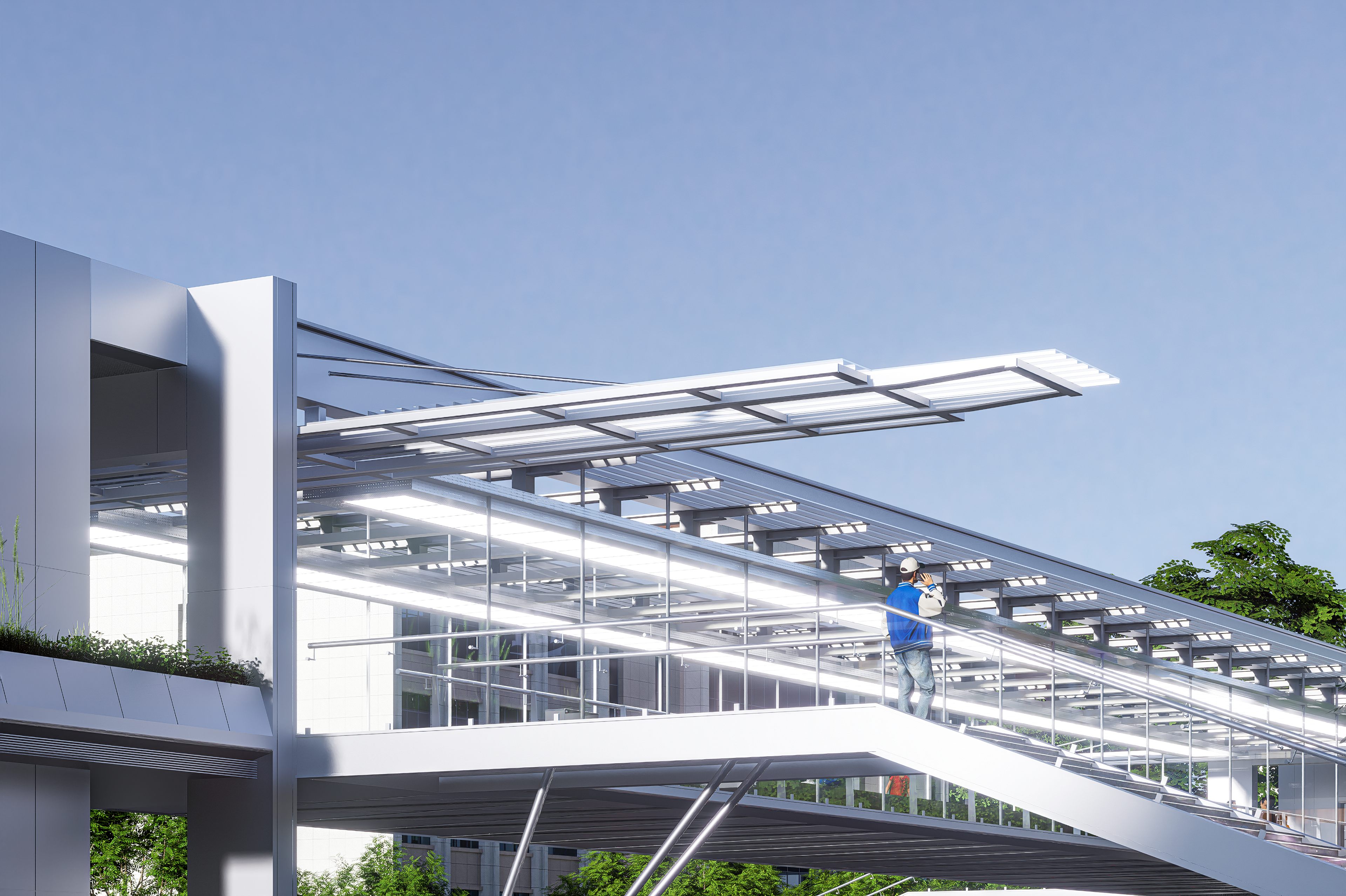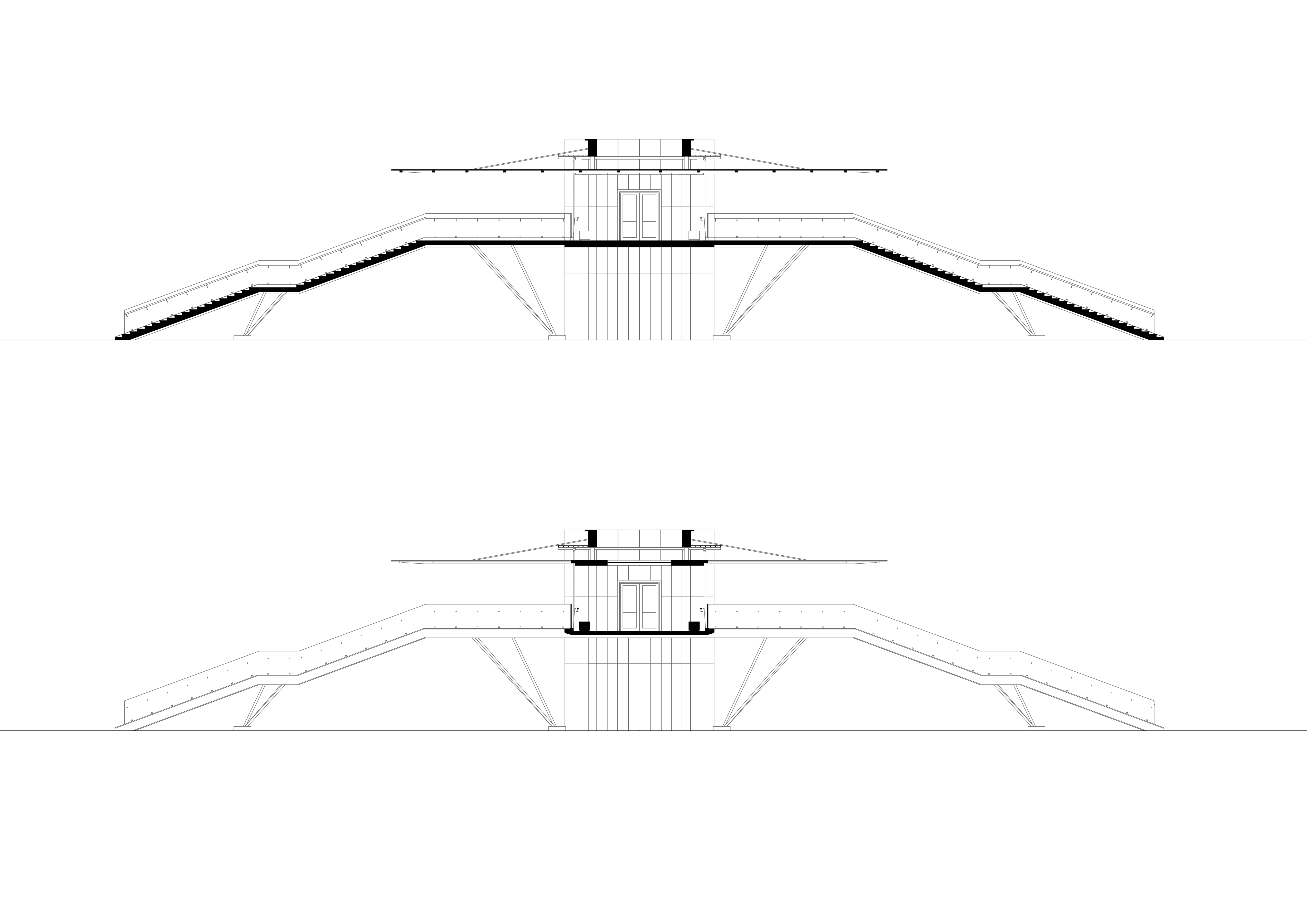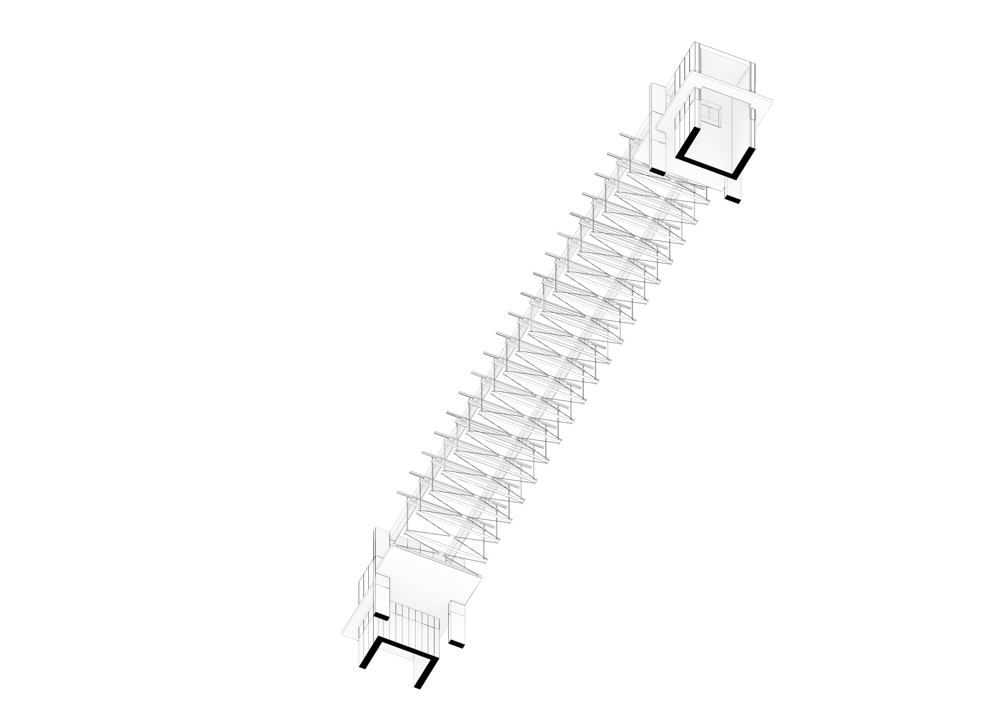 - 最终,我们选择将桁架置于顶端,将人行部分楼板通过金属悬索吊起。桁架梁通过两侧的梁柱结构支撑,并在端点处通过配重下拉进行受力平衡。这样,我们既保证了净空高度,也解决了大跨度,同时在视觉上使得整个设计更加轻盈、现代、简洁。