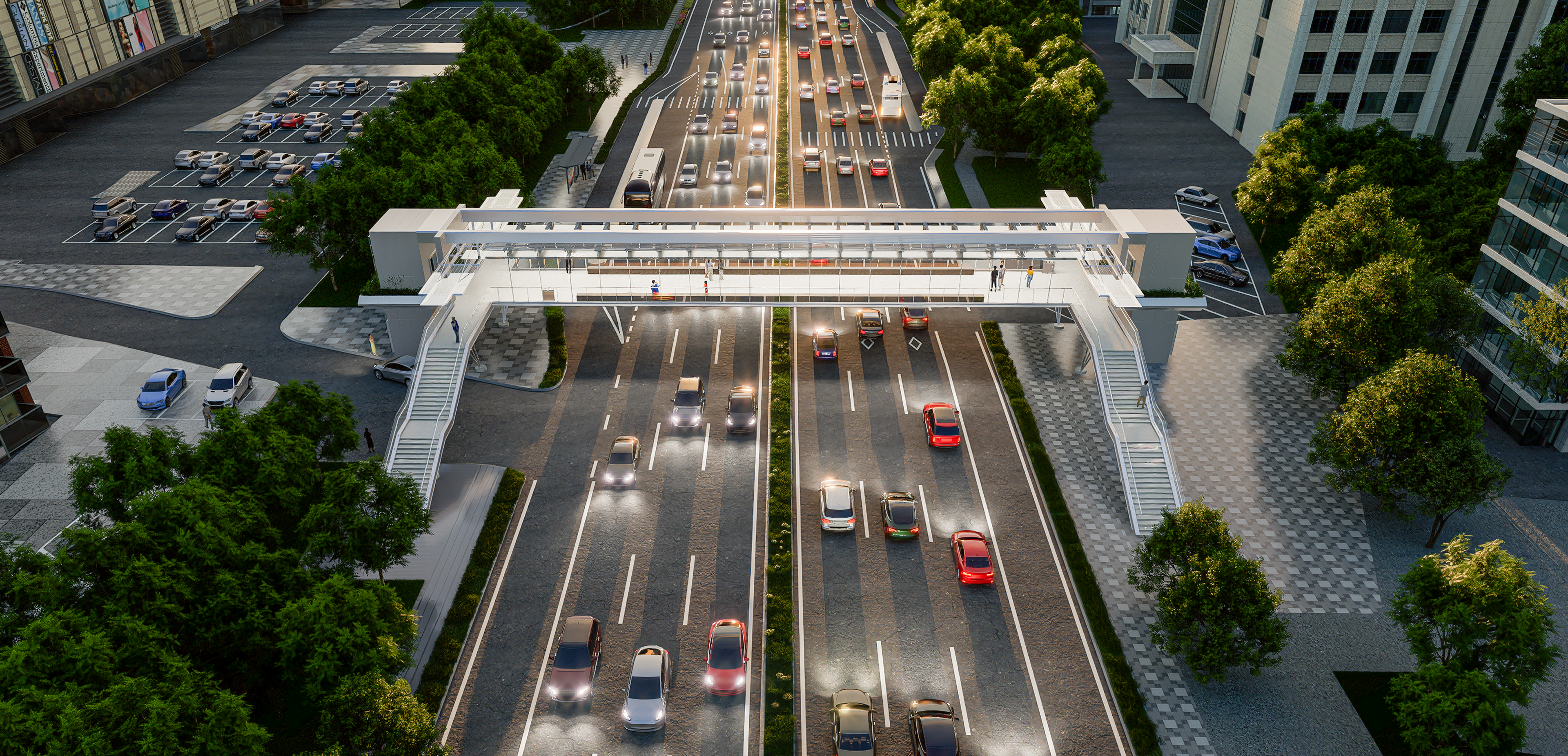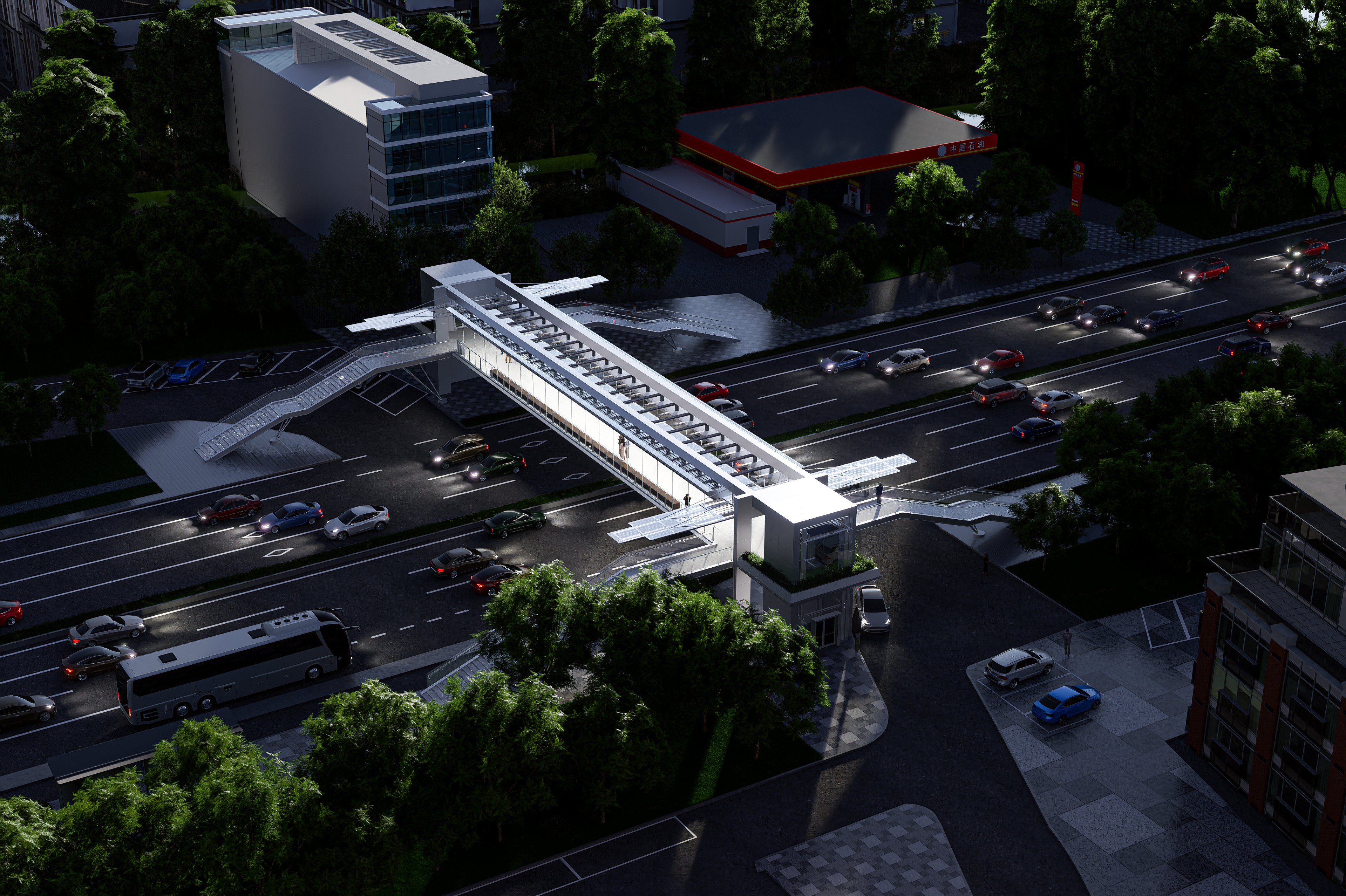 - The project site is located at the intersection of Hunan Road and planned Yunan Road in Pudong New Area, spanning Hunan Road, a major ten-lane thoroughfare in South Shanghai. The west side features a commercial service area, while the east side includes Yukan Hospital and a large residential neighborhood. A bus station is nearby to the north. Given the heavy traffic on Hunan Road, pedestrian crossings affect traffic efficiency. The new pedestrian bridge will connect the commercial and residential areas while alleviating traffic pressure.