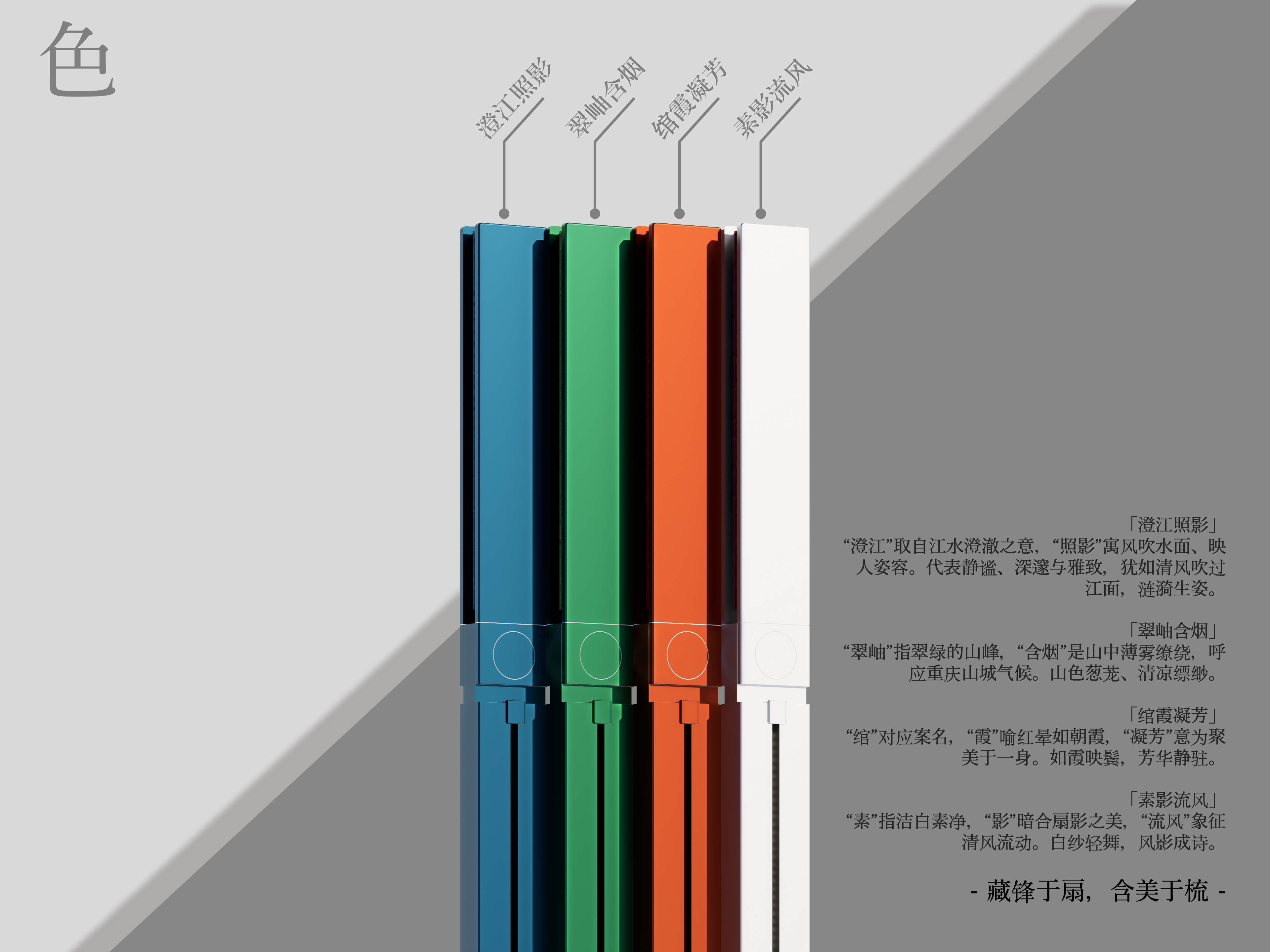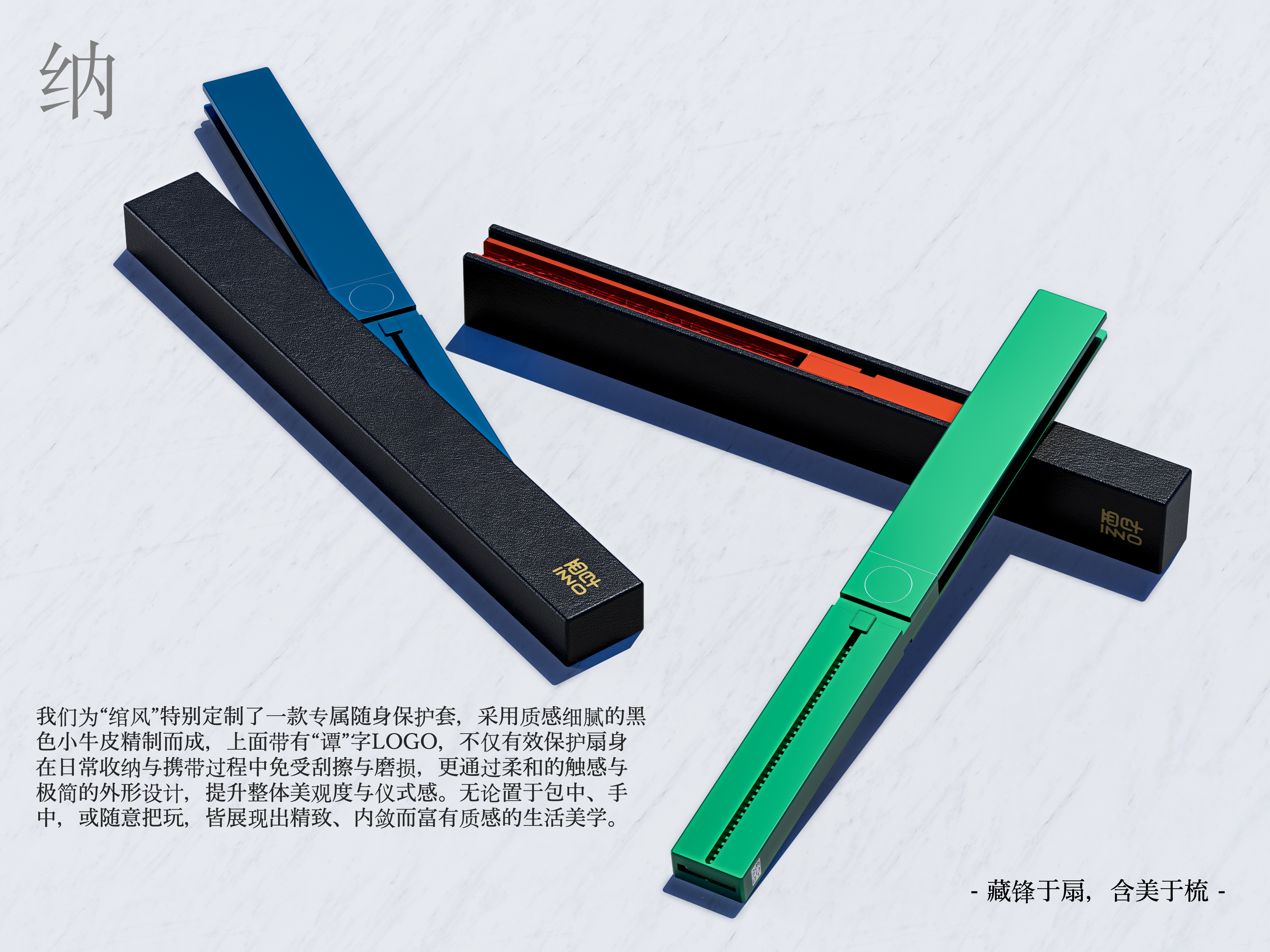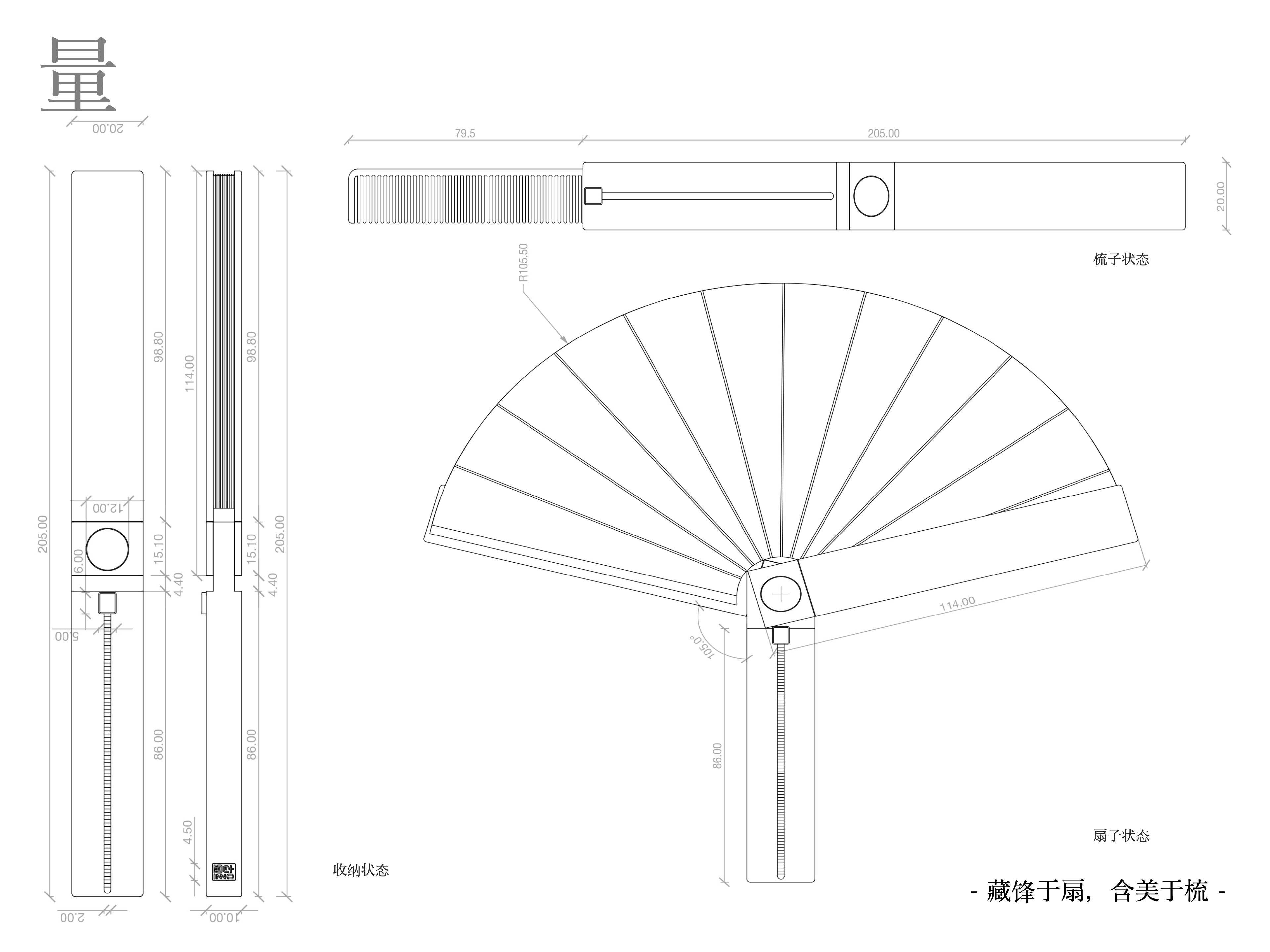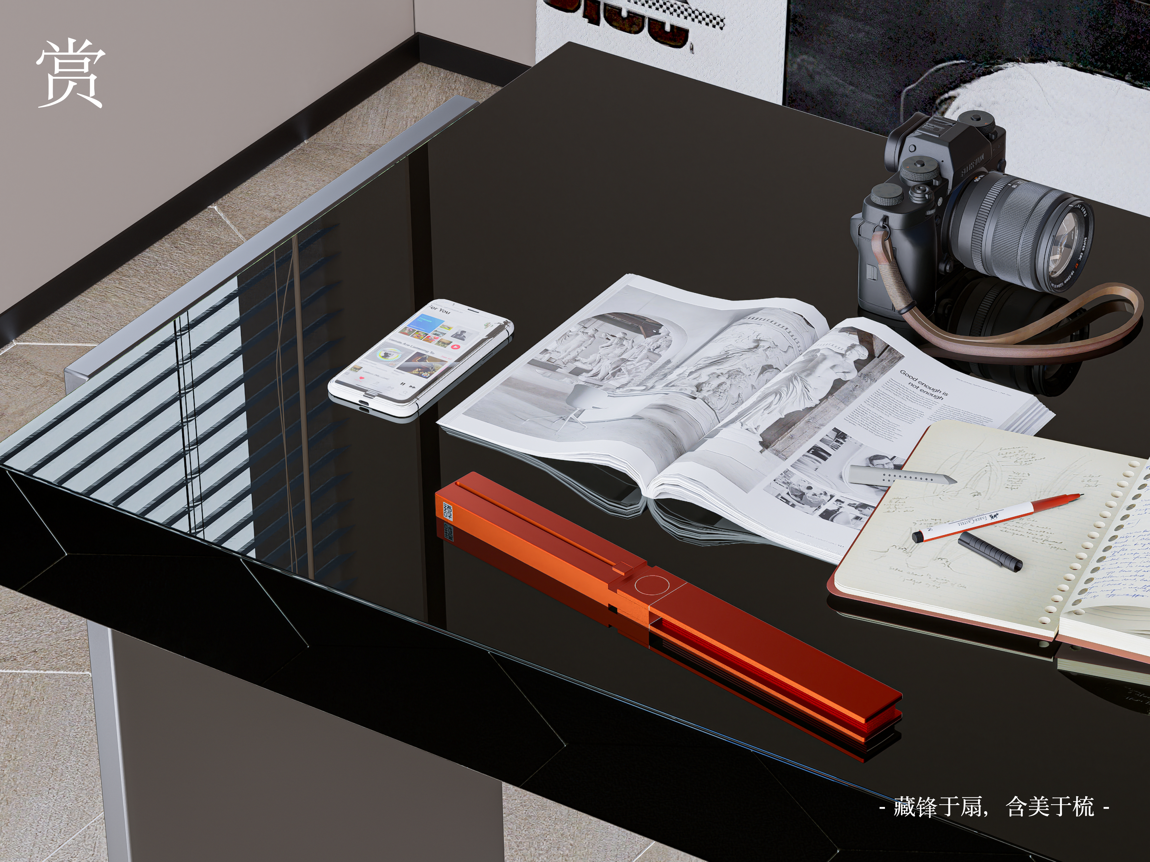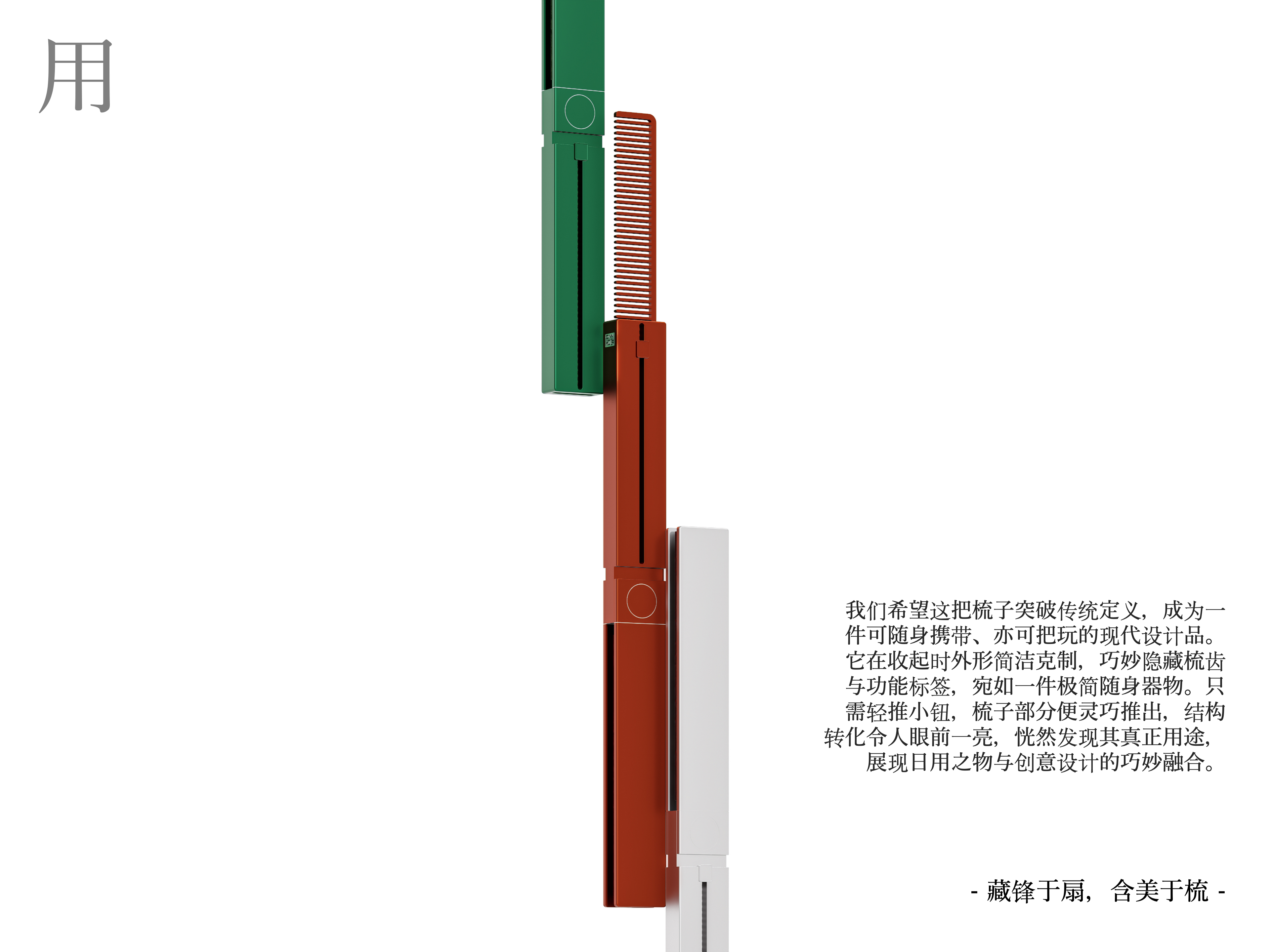 - 我们希望这把梳子突破传统定义,成为一件可随身携带、亦可把玩的现代设计品。它在收起时外形简洁克制,巧妙隐藏梳齿与功能标签,宛如一件极简随身器物。只需轻推小钮,梳子部分便灵巧推出,结构转化令人眼前一亮,恍然发现其真正用途,展现日用之物与创意设计的巧妙融合。