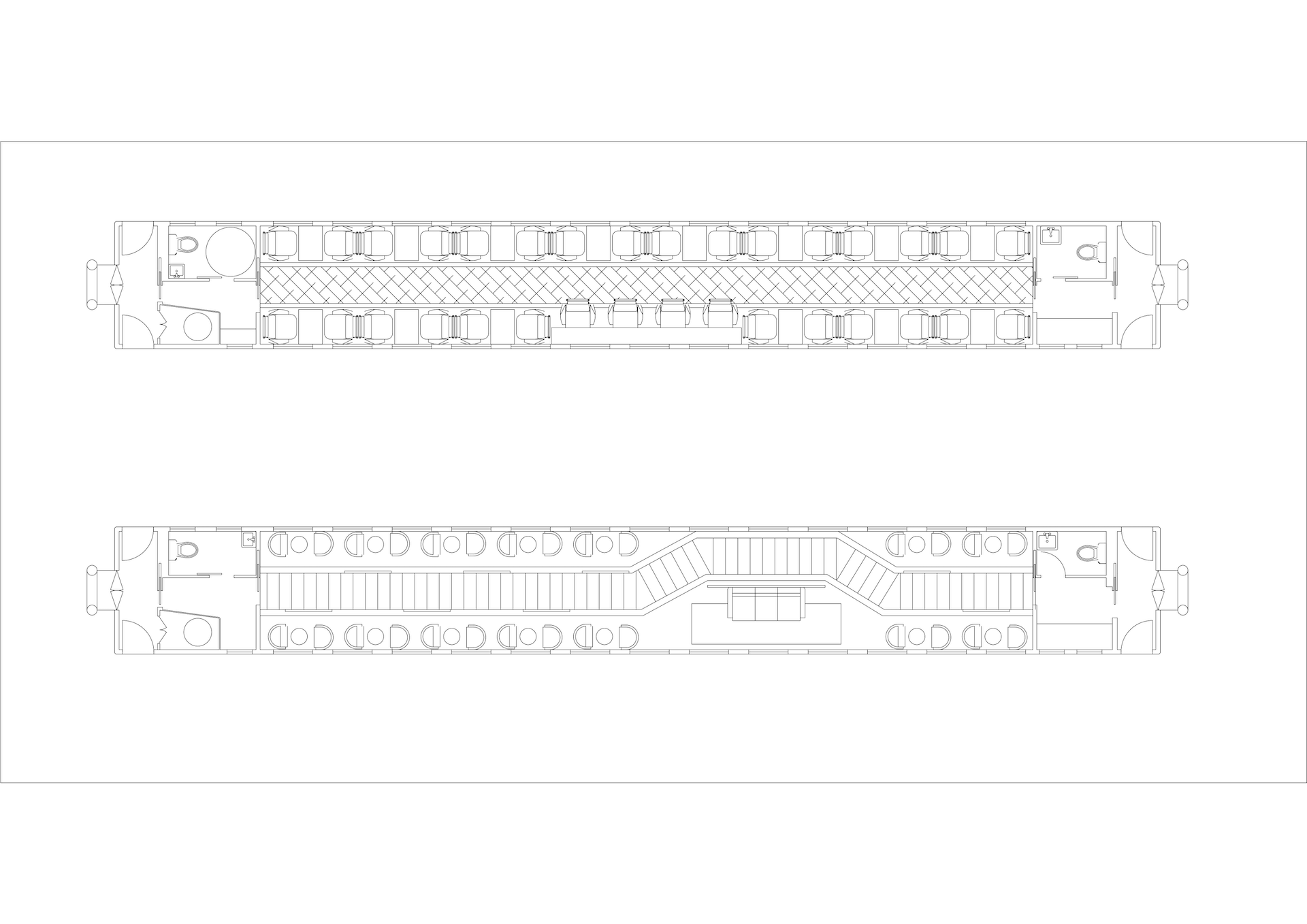 - 平面设计上,坐席车厢设置了32座席,整体空间宽敞明亮,采用对向双座为一组的布局,中部为类似吧台布局,使得出行选择更加灵活;多功能车厢设置最多30座席,融入婺源巷弄的空间体验。