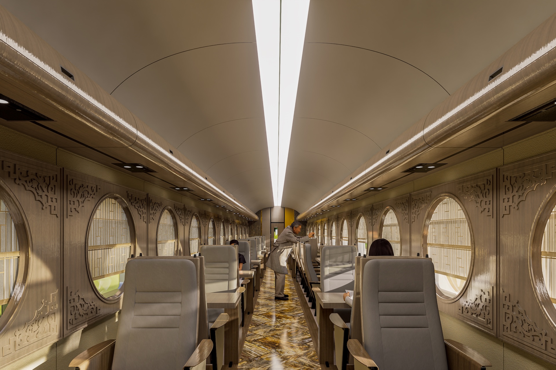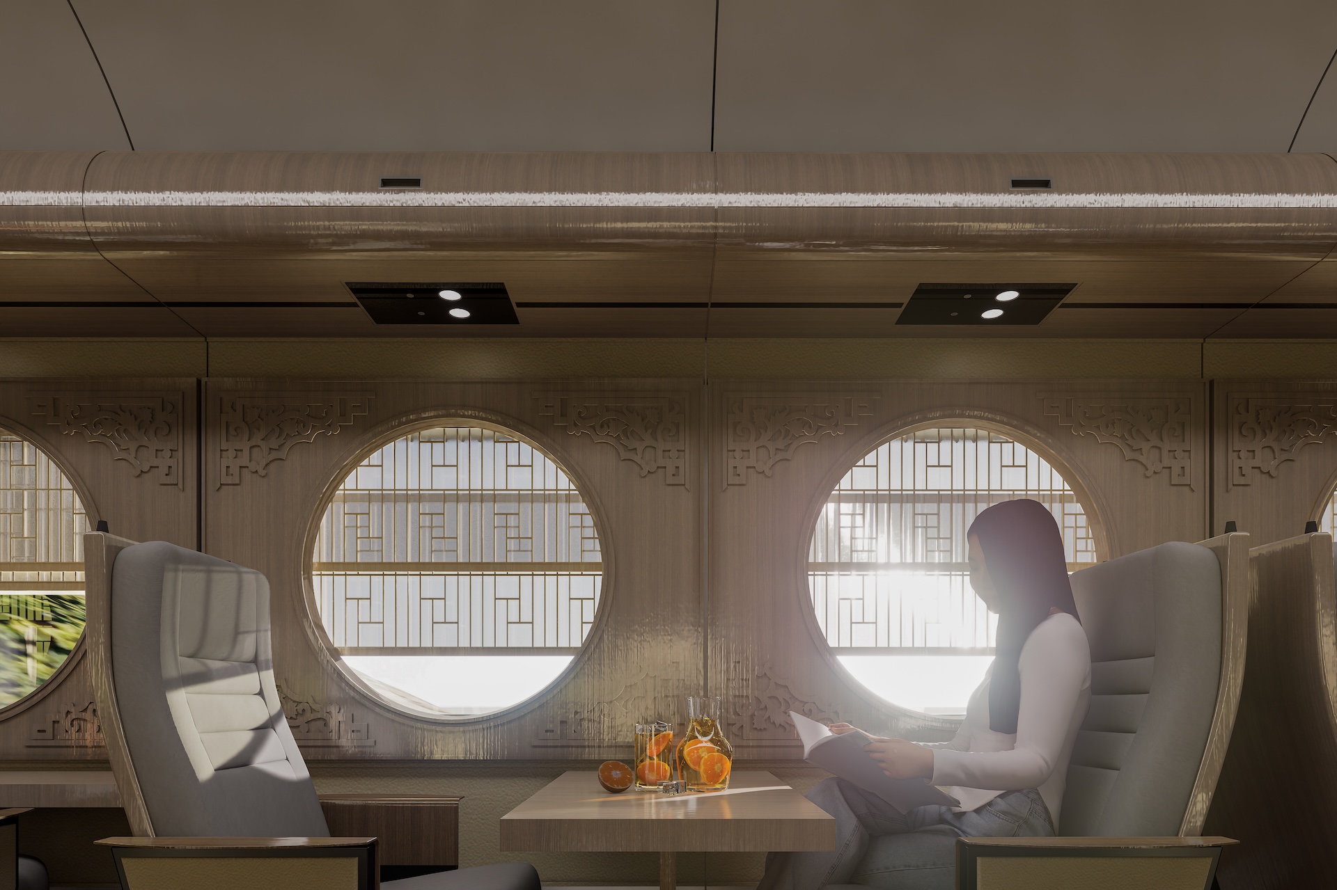 - The interior design of the seating carriage uses natural wood color as the base tone, with seats in light gray as the main color. The ceiling adopts a minimalist design, and the windows are designed in a traditional style. The multi-function carriage also uses natural wood color as the base tone, with blue glass screens used as visual focal points in key areas. Both carriages use large-area light panels to make the interior brighter, and the light panels can adjust color and brightness according to usage and time.