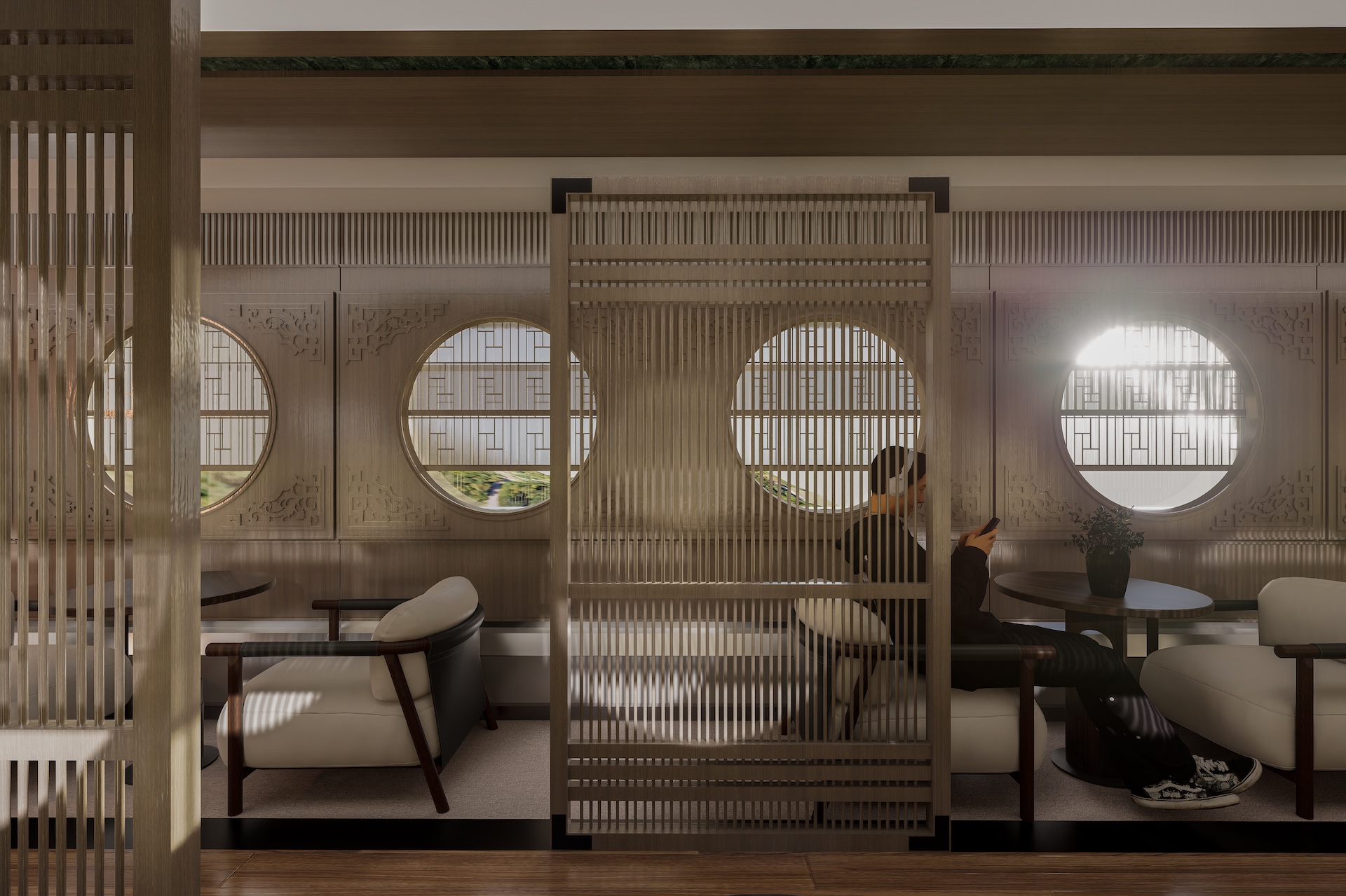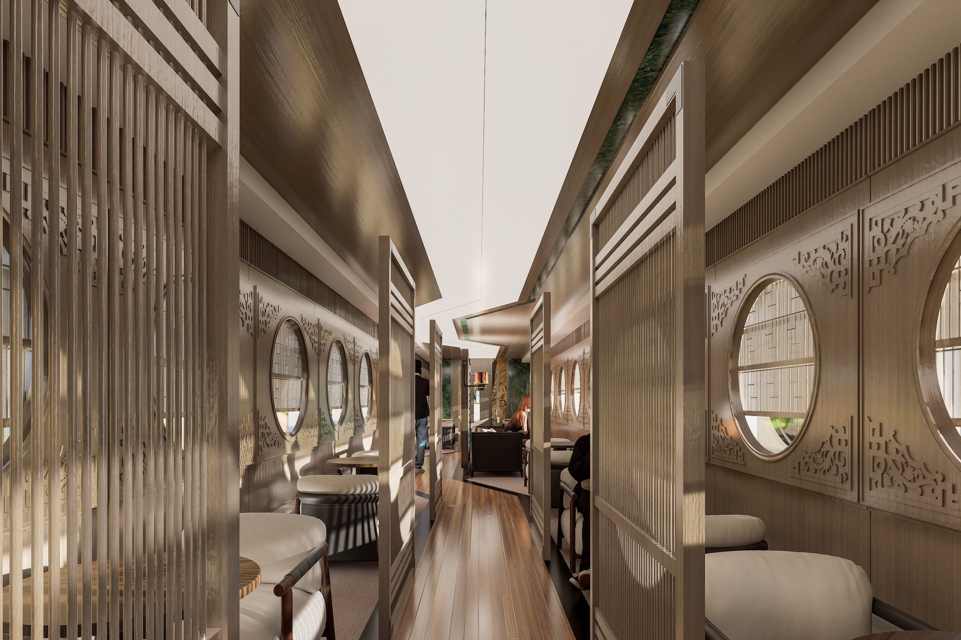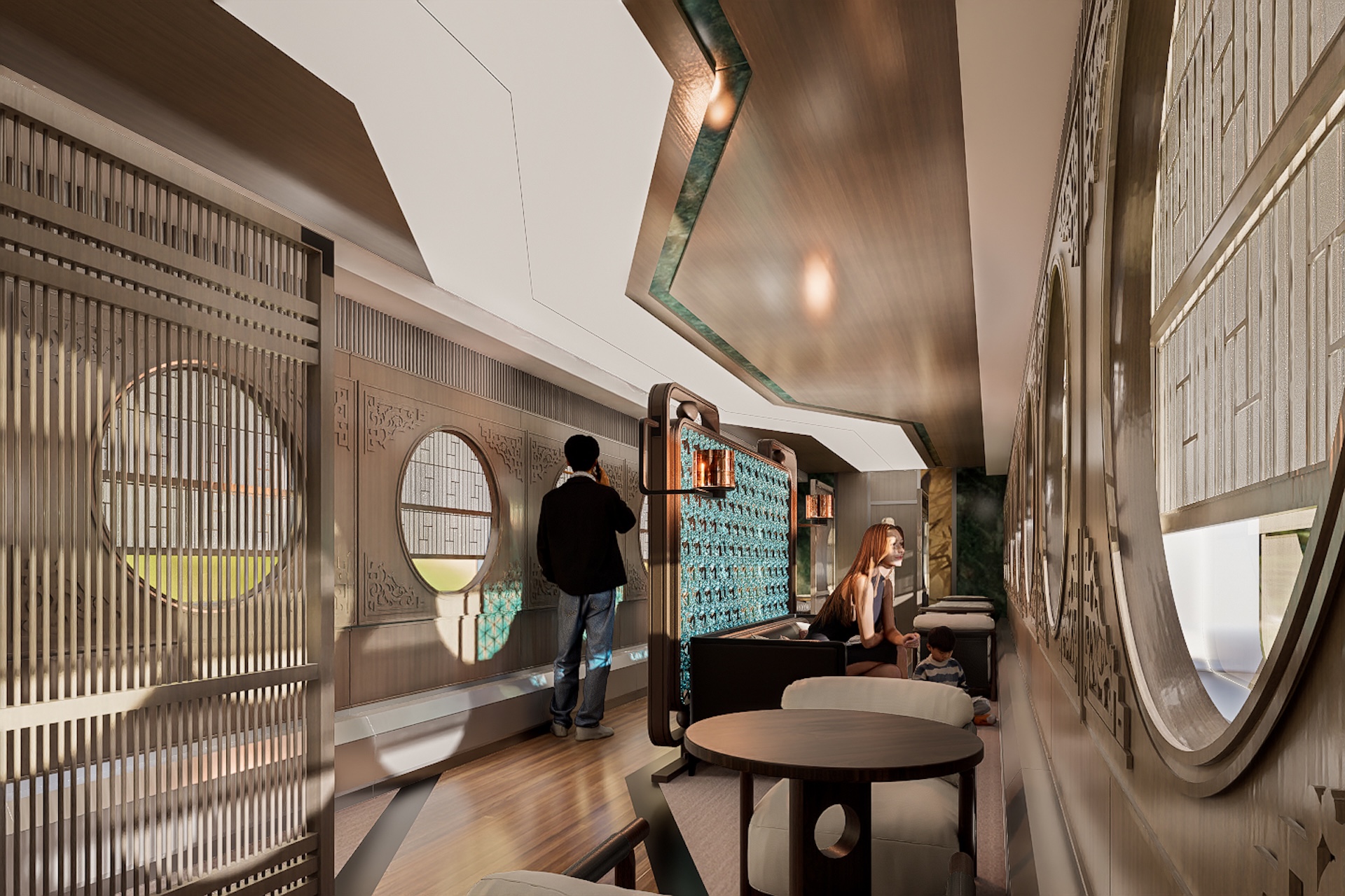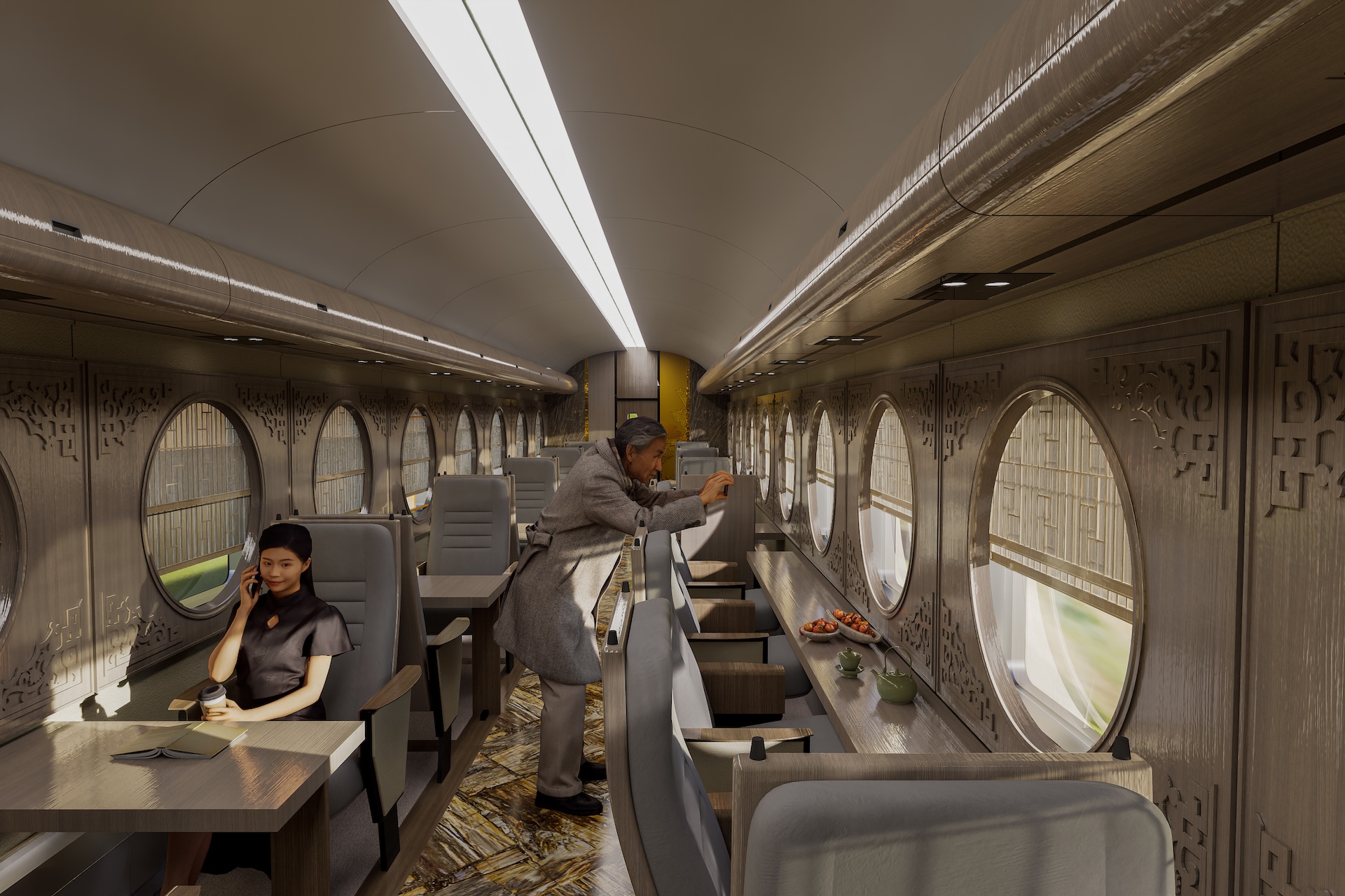 - In the layout design, the seating carriage is set with 32 seats. The overall space is spacious and bright, arranged in face-to-face double seats as one group, with a bar-like layout in the middle, providing more flexible travel options. The multi-function carriage has up to 30 seats, incorporating the spatial experience of Wuyuan alleys.
